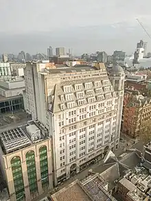 Sunlight House is a 14-storey steel and concrete structure, clad in Portland stone. The building is almost square in plan, with three street frontages, and a large central light-well. There is a basement swimming pool below a leadlight domed skylight at first floor in the centre of the lightwell.[3] Each of the three street façades are seven bays, with the two street corners expressed as three sided towers, which each rise to a four level octagonal turret, topped by a domed lantern and finial.[2] Behind and between the turrets, the top four floors are expressed as a mansard roof with multiple setback square dormer windows, which together with the turrets create a distinctive skyline and a major feature in the city.