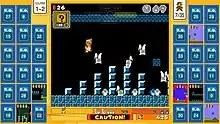 Different enemies appeared in certain levels, with different ways of defeating them. Goombas were the most common enemies. Most enemies could be defeated by jumping onto them.[6] Other enemies would drop a projectile when stomped on, such as the Koopa Troopa, which dropped a shell that could be kicked left or right and would ricochet when it comes in contact with an object. Bowser appeared as a boss in the fourth stage of each world.[7] Enemies defeated by the player were sent to other opponents in real-time, appearing in their levels as an additional hindrance.[8] Players could either manually target their opponents or choose from four types of opponents to attack: players who collected the most coins, players who had the least amount of time remaining, players who attacked the player themselves, or random players.[9] Each player would be assigned a timer that started at 35 seconds. They were awarded additional seconds by eliminating enemies, and doing so in rapid succession yielded higher rewards. Letting the timer run out caused the player to lose.[5]
