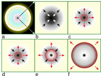 Evolutionary stages of the core-collapse supernova:[15] (a) Neutronization phase (b) In-fall of material and neutrino trapping (c) Generation of shock wave and neutrinos burst (d) Stalling of shock wave (e) Neutrino heating (f) Explosion