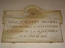 Commemorative plaque at the Alhambra, saying "Washington Irving wrote his Tales of Alhambra in these rooms in 1829" in Spanish