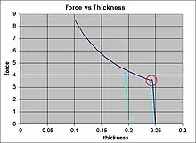 The initial steep section in graph 2 is elastic compression. The effective height of this is reduced by the entry and exit tensions when present, as in a tandem mill. Notice that the curve becomes steeper as the thickness approaches zero, i.e. it would take infinite force to make the steel infinitely thin.