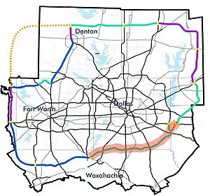 Loop 9 is a proposed state highway that will be located on the southern fringes of the Dallas/Fort Worth Metroplex along the southern Dallas County line westward into northern Johnson County. It will measure about 45 miles (72 km) in length. Although it can be considered the southern counterpart to the President George Bush Turnpike (PGBT), it is actually being re-integrated into a plan for a broad outer loop that would extend far north of the metroplex. Loop 9 and the outer loop are part of a long-term plan to serve the expanding DFW population, forecasted to number 10 million circa 2040.[1]