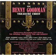 The Benny Goodman Treasure Chest is a jazz album by Benny Goodman, released in 1959.[1] This three-LP Record Box Set was released by MGM Records These are Performance Recordings 1937–1938 by the original orchestra, trio, and quartet featuring Benny Goodman (clarinet) with Harry James/Ziggy Elman/Chris Griffin (trumpet), Murray McEachern/Red Ballard/Vernon Brown (trombone), Lionel Hampton (vibes), Teddy Wilson/Jess Stacy (piano), Hymie Shertzer/Vido Musso/Jerry Jerome/George Koenig/Dave Matthews/Arthur Rollini/Babe Russin (sax), Harry Goodman/Artie Bernstein (bass), Charlie Christian/Allan Reuss (guitar) and Gene Krupa/Dave Tough/Nick Fatool (drums).