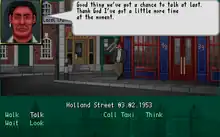 The adventure mode uses static graphics depicting various places with menu interface to control Matt's actions. It is in this mode, where the player buys and sells cars, tools and other equipment needed for thievery, recruits accomplices and scouts for possible target buildings. Every important information as an amount of money, description of tools, cars, loot, etc. can be accessed anytime through the Think menu.[7] Before committing a burglary, the player must collect all the necessary information by investigation of the site. A car and at least one associate with driving skills is also obligatory.
