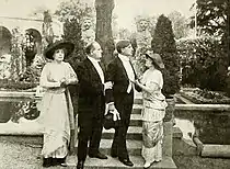 In 1914, the rapidly expanding Lubin Manufacturing Company sought to attract public attention and ticket buyers by convincing stars of vaudeville and the "legitimate" theater, as well as other celebrities, to perform in their first films with Lubin. Two such stage performers contracted by the company in 1914 were the "notorious" actress Evelyn Nesbit Thaw, who made her screen debut in the Lubin production Threads of Destiny, and the comedian Raymond Hitchcock, whose initial foray into films was The Ringtailed Rhinoceros.[5] Widely billed as "'The Funniest Man on the Stage'", Hitchcock had reportedly rejected earlier offers to perform in motion pictures, but the comedian was finally "won over" by Lubin, which created a "unique comedy drama, written especially" for him.[6][7] The Chicago-based trade journal Motography later referred to Lubin's success in contracting Hitchcock for his first screen appearance "a decided triumph".[8]