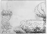 Cole's drawings[9] from his trip to Europe or shortly thereafter also appear to prefigure the Goblet. They show his interest in fountains and basins and are influenced by those he saw during the Italian leg of his voyage, in Florence, Rome, and Tivoli. In one drawing, a series of huge basins adorned with vegetation descends to the sea. Another depicts a single, mossy-rimmed basin of normal size, but the ground-level view makes it appear monumental. Cole's drawings of the Italian volcanic lakes Nemi and Albano are also reminiscent of the goblet's waters and rim, insofar as they suggest that a "basic visual analogy was at work in Cole's thoughts, an analogy between [these] actual landscapes he had observed and the shape of the water vessels and basins he imagined."[10]