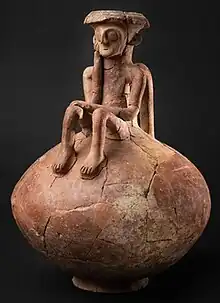 The Thinker from Yehud, also known as the Thinker of Palestine,[1] is an archaeological figurine discovered during salvage excavations in the Israeli city of Yehud. The figurine, which sits atop a ceramic jug in a posture resembling Rodin's famous sculpture "The Thinker," dates back to the Middle Bronze Age II Palestine (c. 1800–1600 B.C.E.). It was found in a tomb accompanied by various items, including daggers, spearheads, an axe head, a knife, two male sheep, and a donkey, all likely buried as offerings. After its discovery, the broken jug had to be stabilised and restored before being displayed in the Canaanite Galleries of the Israel Museum in Jerusalem.