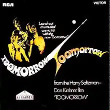 Toomorrow is the soundtrack from the 1970 film,[2] featuring the band Toomorrow with British - Australian singer Olivia Newton-John (her first major release album). The film was a sci-fi musical mix directed by Val Guest and was Newton-John's second movie. It was Don Kirshner's less successful follow up to his work with The Monkees.[3]