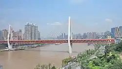 The Dongshuimen Bridge (Chinese: 东水门大桥; pinyin: Dōngshuǐmén dàqiáo) and the Qiansimen Bridge (Chinese: 千厮门大桥; pinyin: Qiānsīmén dàqiáo), known collectively as the Twin River Bridges, are a pair of bridges that form a road and rail connection in Chongqing, China. Consisting of two cable-stayed bridges and a tunnel across the Yuzhong peninsula where the heart of Chongqing's commercial & financial district Jiefangbei CBD is located, the connection opened in 2014.