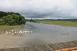The valley of Vorsklytsia is trapezoidal with a width of 4–5 km (2.5–3.1 mi) and the river runs in great meanders. The floodplains are swampy, especially in the lower reaches, the right bank is often quite steep, the left bank rather low. The gradient of Vorsklytsia is 0.77 m/km. The river freezes in early December and remains frozen until mid-March.[1][2]