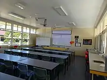 The first high schools were established within existing technical colleges, utilising their buildings. The first purpose-built high school buildings were constructed in 1917 and were large, elaborate buildings that were variations of a standard design introduced in 1914 (C/T8) as well as vocational buildings built to standard designs. In the 1950s the number of high schools in Queensland increased significantly. The grounds were large, greater than 12 acres (4.9 ha) providing ample room for sports facilities. From their introduction, the design of high school buildings was the responsibility of the Department of Public Works (DPW).[10] The general classroom buildings were the same standard types as used for primary schools but those for high schools included rooms with minor alterations for science laboratories, domestic science classes, workshops for woodwork and metal work, and libraries.[11] The buildings were designed to reflect educationalists' modern requirements, favouring "lighter, loosely grouped, flexible" buildings.[12][1]