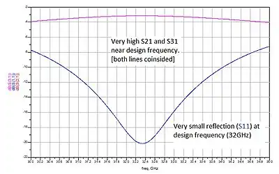 Inspection of the S matrix reveals that the network is reciprocal (), that the terminals are matched (), that the output terminals are isolated (=0), and that equal power division is achieved (). The non-unitary matrix results from the fact that the network is lossy. An ideal Wilkinson divider would yield .