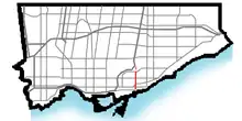 The southern section in Toronto runs just under 4 kilometres (2.5 mi), and begins near Ashbridges Bay on the shore of Lake Ontario, at Lake Shore Boulevard, which ends by curving north to default into Woodbine.[1] Woodbine then continues north to O'Connor Drive.