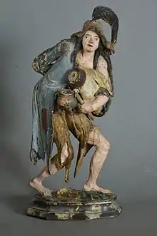 In Val Gardena, the carving industry began as early as at the beginning of the 17th century. The woodcarvers produced mainly statues for churches and religious figurines.[2] The production of beggars started in the late 17th century. Beggars were part of the rich production from Gröden of figurines of genre art as the figurines representing the four seasons.[3] In the baroque period (17th–18th century), the production of those figurines was very rich; Gröden counted up to 300 carvers. The woodcarving production was sold through a network of merchants originating from Gröden and residing in most of the major European cities. The last production of beggars ended in the beginning of the 19th century when the carving of wooden toys prevailed in the valley.[4]