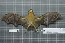 The yellow-throated big-eared bat or orange-throated bat[2](Lampronycteris brachyotis) is a species of bat that ranges from southern Mexico to Brazil. It is the only species within the genus Lampronycteris.[2] A frugivore and insectivore, it is found in lowland forest up to an elevation of 700 m.[1] Its activity is greatest in the first two hours after sunset, and peaks again after midnight.[1]