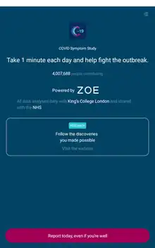 The app was created in 2020 in response to the COVID-19 pandemic, in a collaboration between Zoe, King's College London, Guy's and St Thomas' Hospitals. with funding granted by the UK government until April 2022.[1] The purpose of the app was to track COVID-19 symptoms and other salient data in a large number of people, to enable epidemiological results to be calculated.